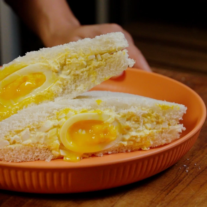 A Soft, Creamy Sandwich with Egg Mayo, Mustard & Jammy Egg Center - A study in simplicity and balance with perfectly half-boiled eggs in pillowy milk bread.